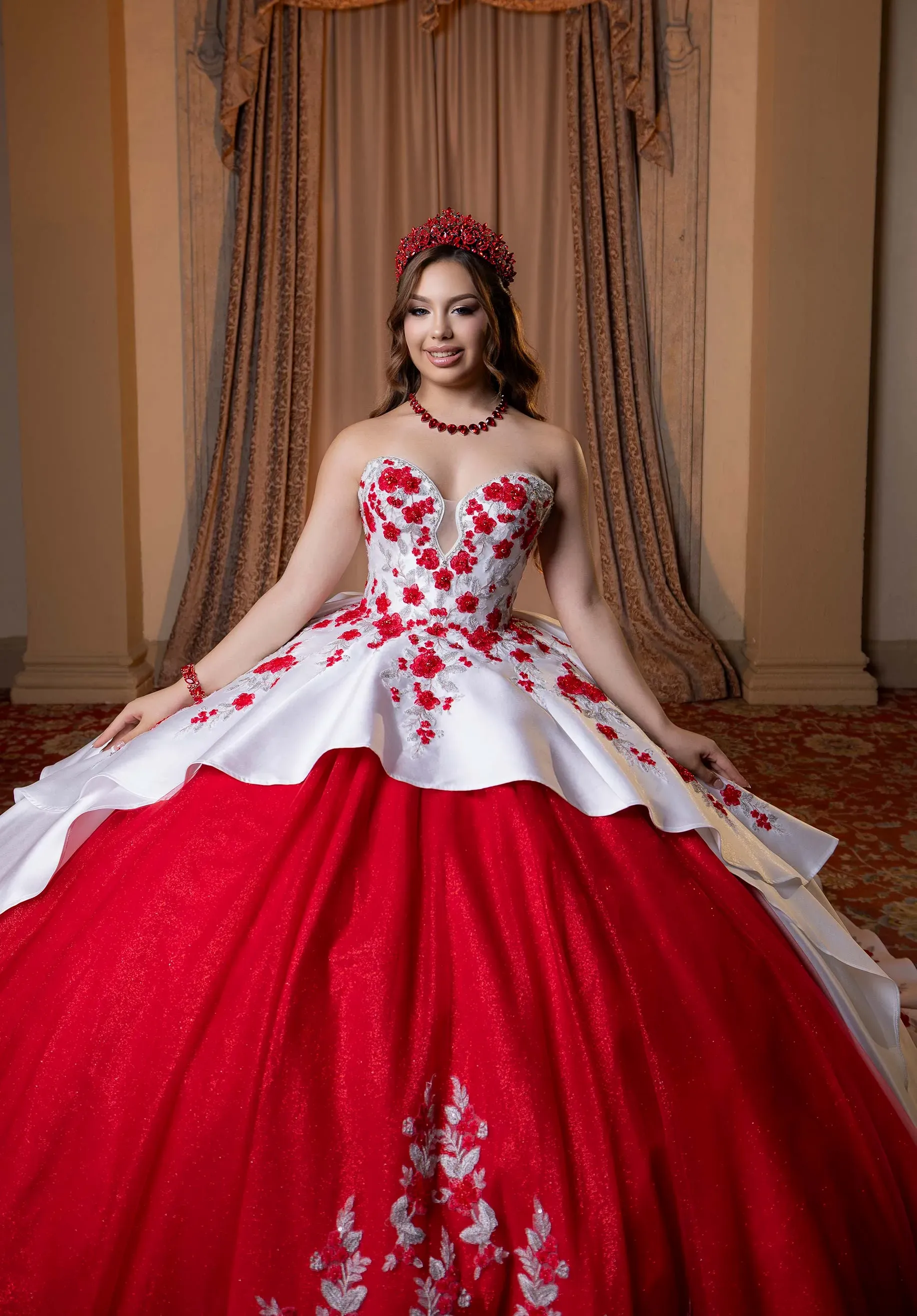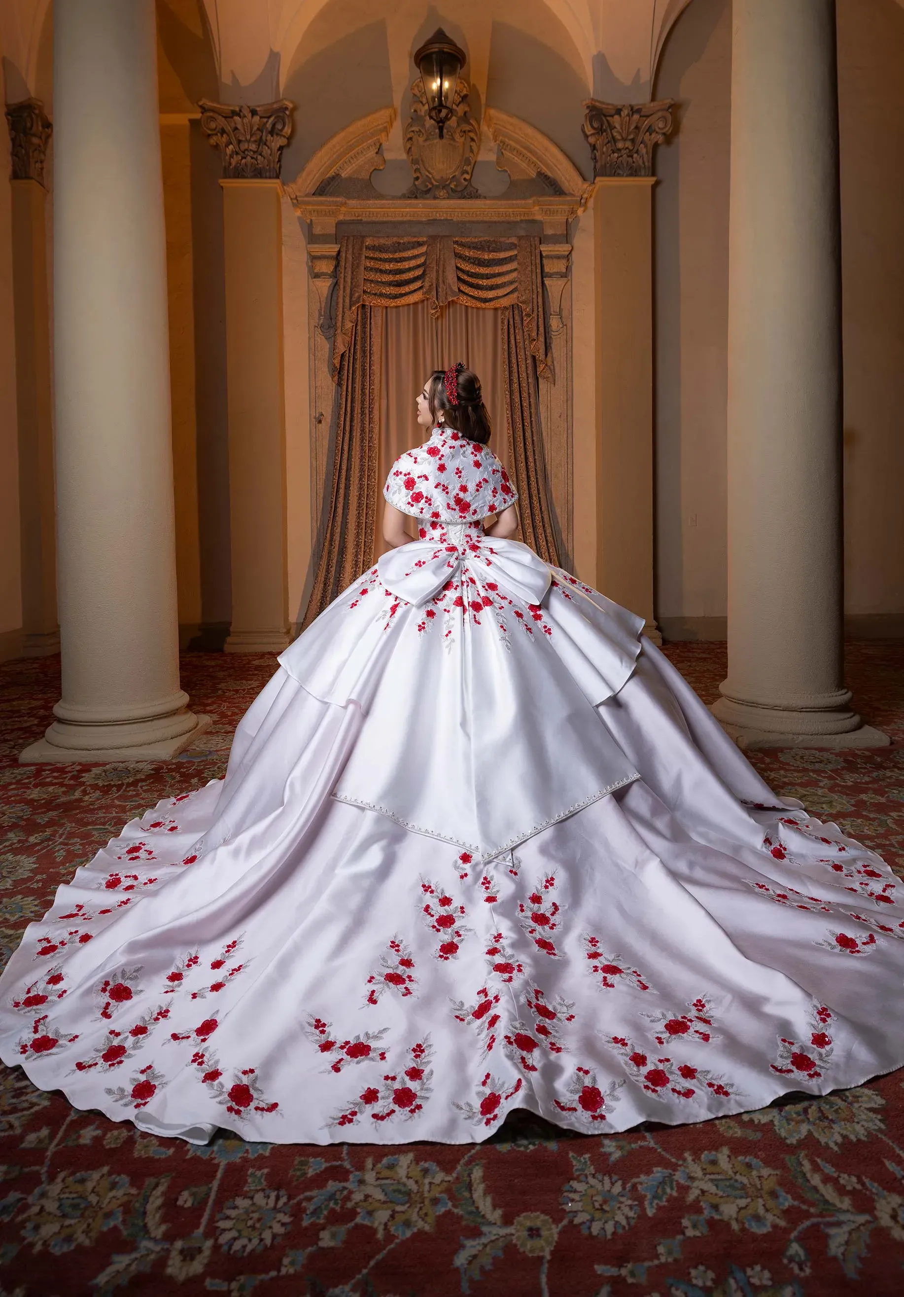 Turn every step into a moment of glamour in the Brandy quinceañera dress. The Mikado bodice features a plunging strapless sweetheart neckline, paired with a detachable capelet adorned with contrasting embroidered and beaded floral appliqués. These stunning details cascade down the overskirt and shimmer across the glitter tulle underskirt, finished with a matching detachable double-loop bow. Brandy combines drama and elegance, creating a look that?s as unique as the quinceañera herself.